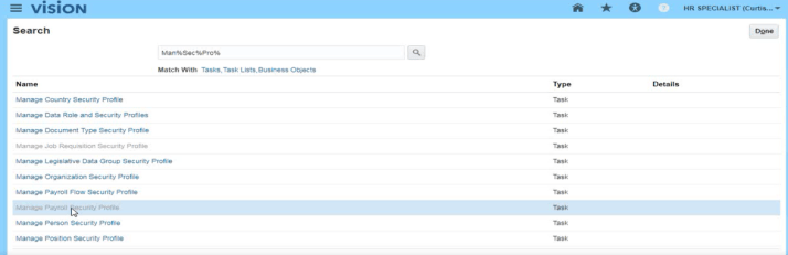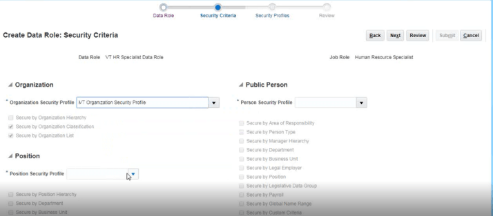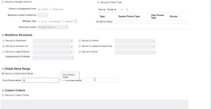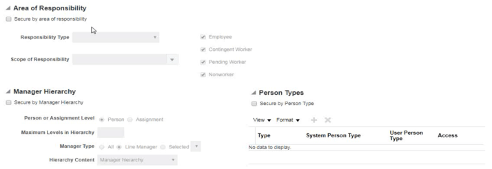 - Data Security: Once user gets into particular user interface then data security determines what legal entity, job, grades, organizations and people information user has access to.
