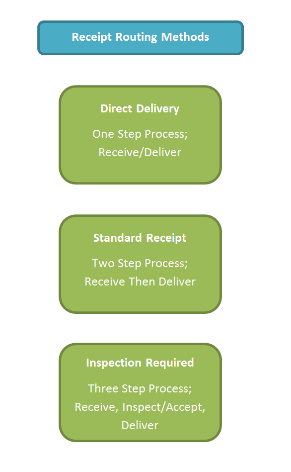 This routing method requires three tasks to be done for each receipt. Receive, Inspect / Accept, Deliver thereby increasing the procurement lead time. Please note that ‘We do Inspect the material’ is not a good enough reason to go in for ‘Inspection Required’ routing method. This routing method is to be used only when Payment is linked to the Inspection Certificate and the match type is 4-Way Matching. |
