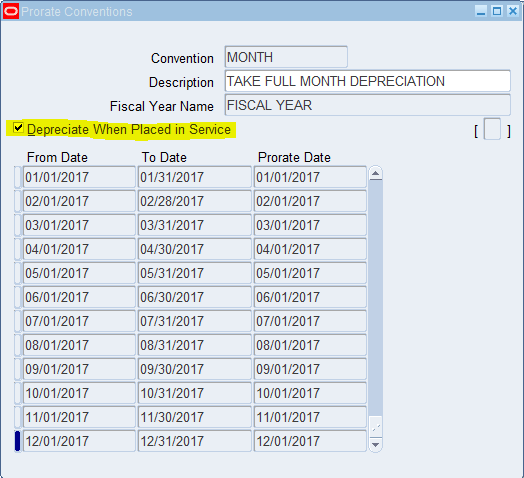 Designates whether to start taking depreciation in the accounting period that corresponds to the date placed in service or to start taking depreciation in the accounting period that corresponds to the prorate date.