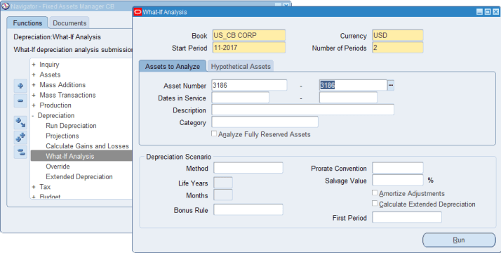 What-If depreciation analysis allows you to forecast depreciation for a group of assets in different scenarios without changing your data. You can enter your different combinations of parameters in Oracle Assets or in Report Exchange (ADI).