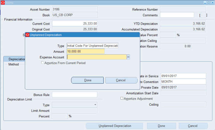 Unplanned depreciation is a feature in Fixed Assets to handle unusual accounting situations in which you need to adjust Net Book Value and reserve for an asset without affecting cost. You can enter unplanned depreciation by asset and by book for any current period during the life of an asset in either your tax or your Corporate book. Unplanned depreciation updates the year to date, life to date and net book value of an asset.