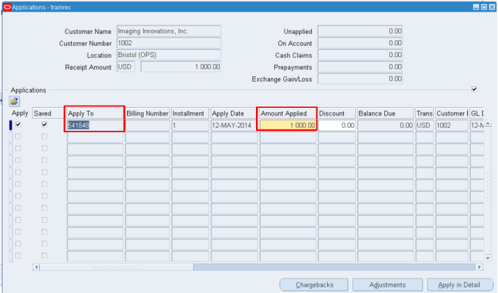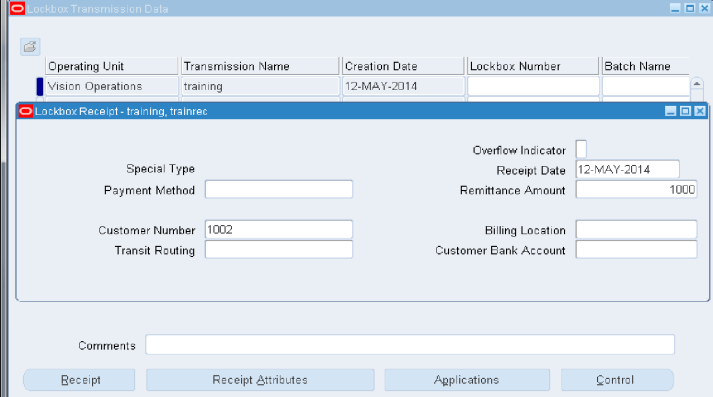 Applying Receipts Via Lockbox Transmission includes customer and invoice information: