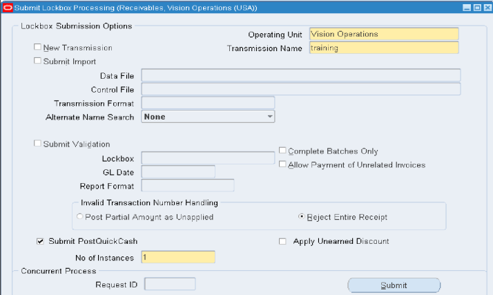 These steps can be submitted one at a time, or all at the same time from the submit Lockbox Processing window. Responsibility: Receivables Manager Navigation: Interfaces > Lockbox |