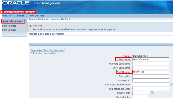 Responsibility: Cash Management Manager Navigation: Setup > Bank > Banks