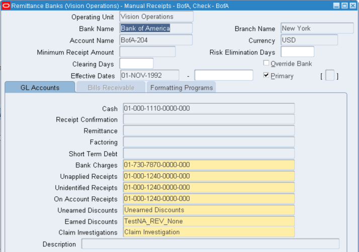Receivables uses receipt methods to account for the receipt entries. One can assign multiple banks to each receipt method, but only one bank account can be primary account for each currency. |