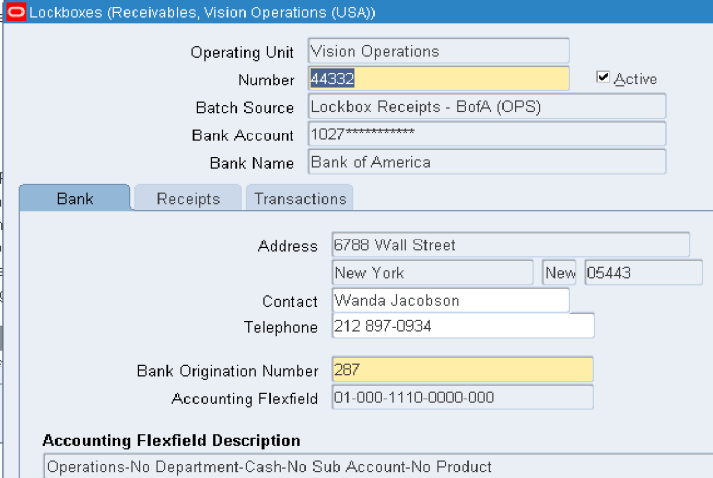 →Navigation: Setup > Receipts > Lockboxes > Lockboxes > Bank Tab Define Lockboxes to use the Receivables Autolockbox program